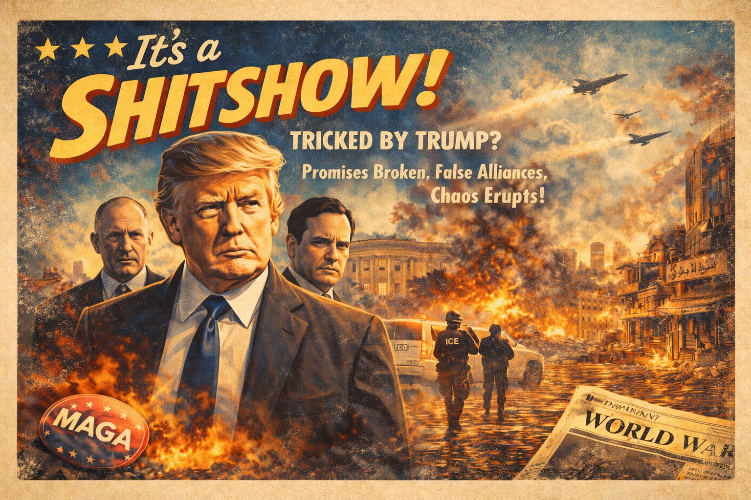 Auf jeden Fall das wichtigste dieser Versprechen hat Turmp vergangener Woche gebrochen. Egal, wie sich der Konflikt entwickelt (darüber geht es im zweiten Teil für zahlende Abonnenten) - MAGA ist tot. Trump ist nicht mehr als eine Neocon-Fratze. Egal, ob der Krieg im Nahen Osten morgen mit Verhandlungen beendet wird (unwahrscheinlich), oder sich zu einem Flächenbrand entwickelt, der uns noch Jahre beschäftigen wird (wahrscheinlich), Trump ist unglaubwürdig geworden. Schlimmer noch: Er hat alle getäuscht.