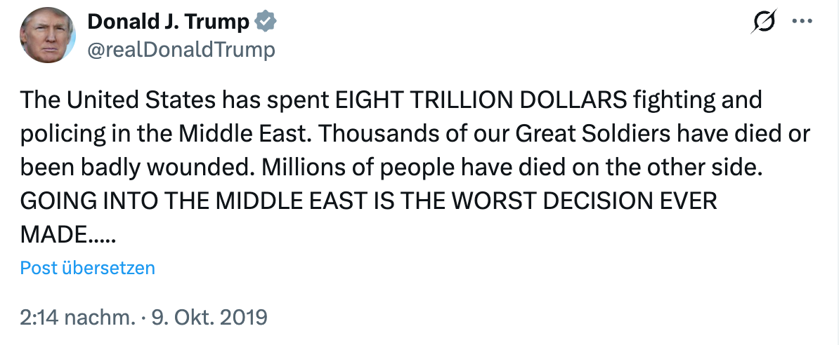 Vor allem zog Trump in den Wahlkampf mit dem Versprechen, keine neuen Kriege zu beginnen, und alte zu beenden.